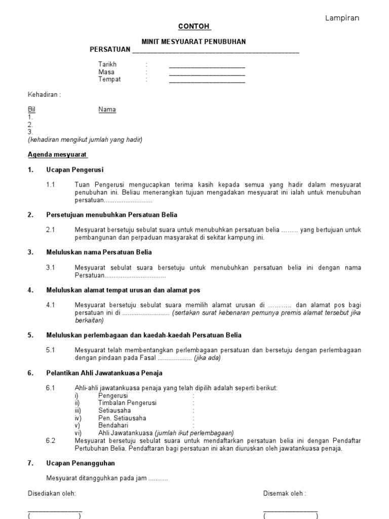 Minit mesyuarat penubuhan 'r10 archery club' tarikh : Contoh minit mesyurat penaja penubuhan. Oleh itu, semangat kejiranan yang tinggi dan bermuafakat, merupakan antara faktor penting yang perlu diterapkan di kalangan penduduk impian makmur. Bilik mesyuarat seri wangsa kehadiran : Aturcara mesyuarat agung pkktsmd 2017 masa agenda 07:20 pm mula pendaftaran | solat maghrib 07:45 pm ceramah khas saham akhirat 24 pengesahan minit mesyuarat agung 2016 minit persatuan khairat kematian taman samudra mitra dan delfina.