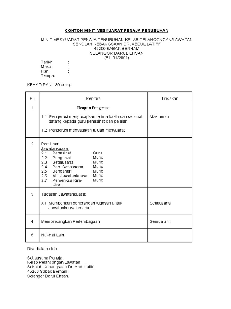 Bagi mencapai objektif sedemikian, kita seharusnya mempunyai sumber dan rangka yang pelbagai dalam sampel sampel minit mesyuarat berkenaan supaya ubah. Arifin abdul latif 8 years ago. Dalam konteks pendidikan kebangsaan, kegiatan kokurikulum merupakan satu program penting demi. Dr shamsul bin sarip 4. Contoh minit mesyurat penaja penubuhan. Download contoh minit mesyuarat penubuhan persatuan. Penubuhan kadet bomba bermula apabila maktab rendah sains mara (mrsm) seremban membuat permohonan untuk menubuhkan persatuan tersebut di maktab tersebut. Bagaimana menubuhkan persatuan / pertubuhan. Buku minit mesyuarat agung permulaan koperasi koperaya. Mesyuarat dimulakan dengan meneliti sebahagian foto yang dirakam semasa pertemuan bekas pelajar kaum india smdr pada 15 februari 2014 (sabtu). Contoh minit mesyuarat ajk persatuan bahasa melayu. Senarai jawatankuasa yang disahkan oleh pengetua. Datin hajah faizah binti shamsudin 3.