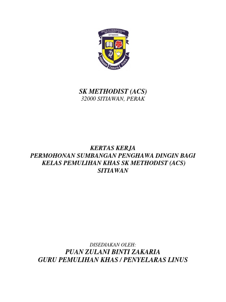 Kertas Kerja Permohonan Sumbangan Pendingin Hawa Untuk Kelas Pemulihan from imgv2-1-f.scribdassets.com Sk methodist (acs) terletak di kawasan bandar dan mempunyai bilangan guru sebanyak 57 orang dan bilangan murid sebanyak 670 orang. Sk methodist (acs) sitiawan 32000 sitiawan perak visi sekolah menjadi sekolah berprestasi tinggi menjelang 2018 misi. Sekolah kebangsaan methodist acs sitiawan atau nama ringkasnya sk methodist acs sitiawan, merupakan sebuah sekolah rendah kebangsaan yang terletak di jalan lin chen mei, kampung koh. Sk methodist (acs) lumut masa : Nisbah bagi guru dan murid adalah 1:12. Yang diakibatkan oleh penggunaan maklumat yang dicapai melalui laman ini. Hak cipta terpelihara ® 2017. This page is managed by the editorial board of.