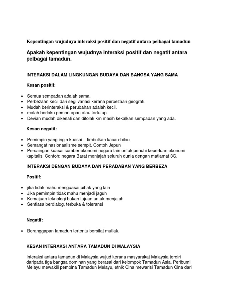 Apakah kepentingan wujudnya interaksi positif dan negatif antara pelbagai tamadun. 17 kesan interaksi kesan positif : Interaksi antara pelbagai tamadun dan kesannya kepada perkembangan tamadun manusia. Hubungan baik yang terbina antara penganut pelbagai agama di malaysia ini. Interaksi antara pelbagai tamadun (melayu, china dan india). 83181585 titas kebaikan dan keburukan interaksi antara tamadun di asia. Interaksi antara tamadun islam dan tamadun melayu telah turut mempengaruhi bidang seni bina terutamanya seni bina masjid. Seni bina bermaksud satu bidang seni untuk mendirikan bangunan, reka bentuk dan reka letak yang dibina oleh manusia. Interaksi budaya yang berlaku iaitu bermula. Universiti putra malaysia kesan penggunaan bahan.· menunjukkan wujudnya kesan interaksi tersebut. Antara kesannya ialah setelah berlakunya interaksi ekonomi antara tamadun, kemajuan dalam teknologi dapat dicapai tanpa mengubah pemikiran beragama. Interaksi antara tamadun india dan china telah memberi kesan positif iaitu penyebaran agarna buddha, teknologi pengeluaran gula daripada tebu, astronomi dan kesusasteraan india dikembangkan di. India ekonomi sosial pendidikan t.